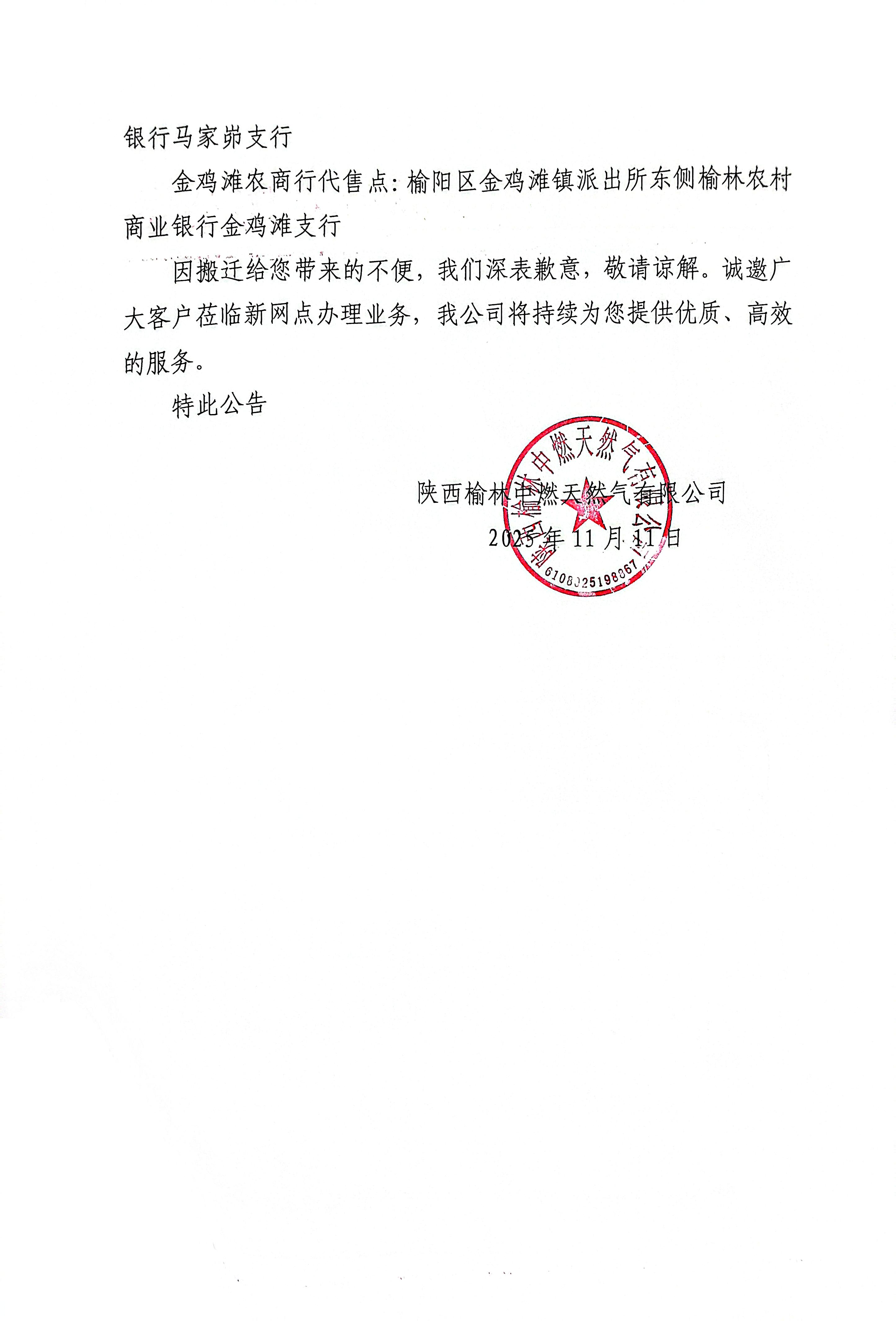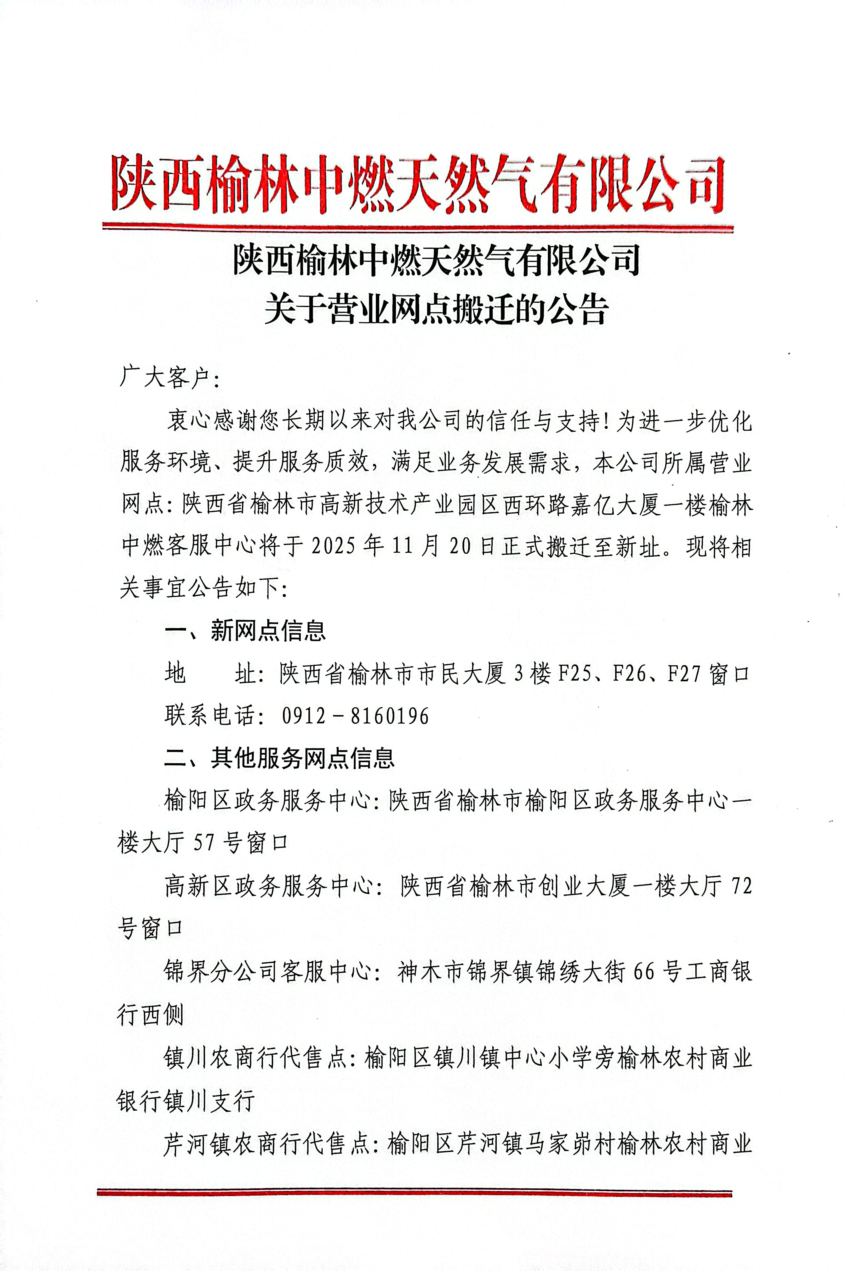 陕西榆林中燃天然气有限公司关于营业网点搬迁的公告